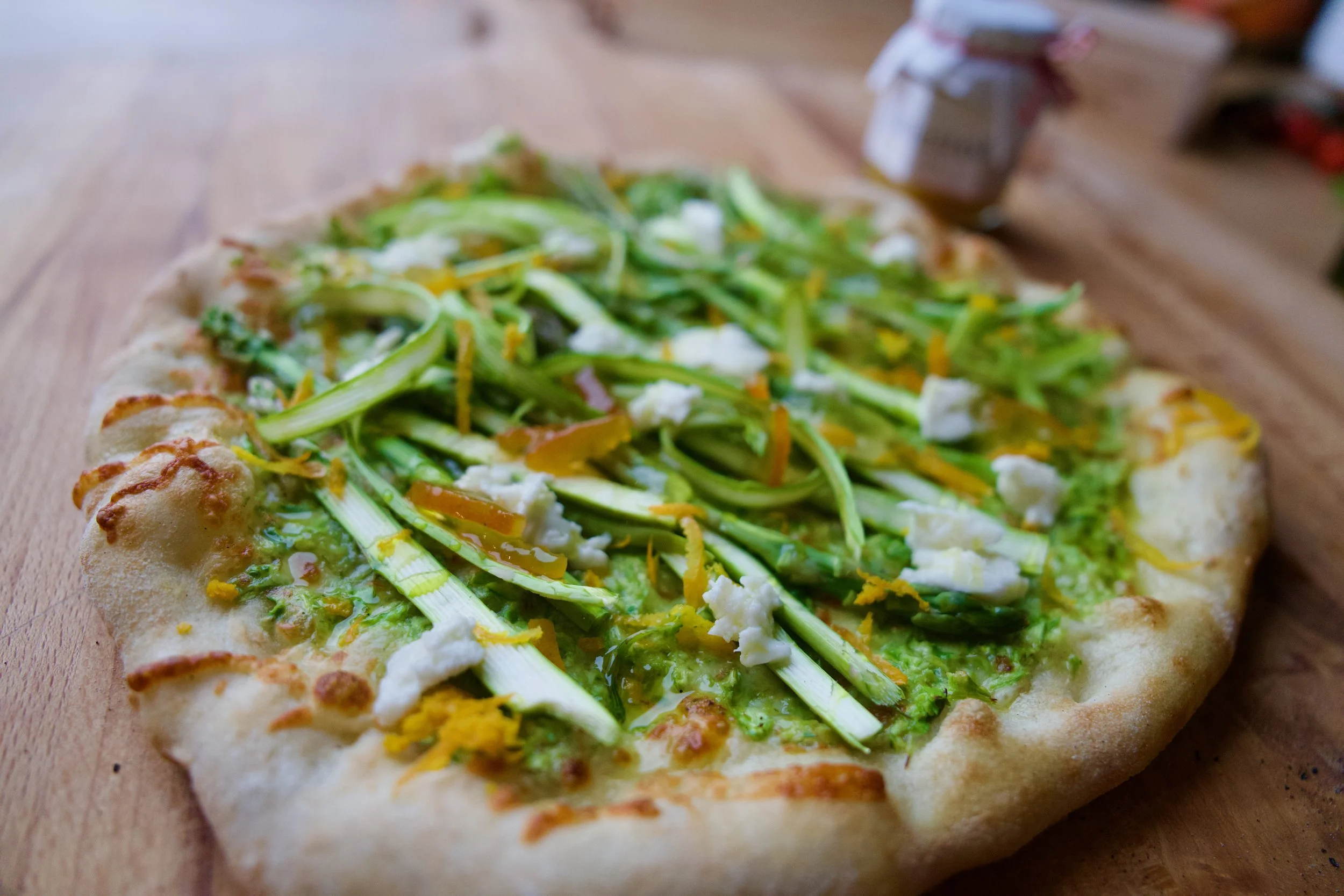 Denne pizzaen er vår lille kjærlighetserklæring til den følelsen: kremet, grønn og frisk, med et løft av bitter appelsin fra Litlestøl Påskemarmelade.